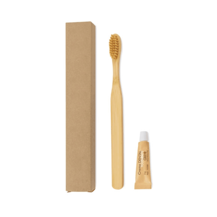 Set dental de viaje presentado en una caja de cartón. Incluye un cepillo de dientes realizado en bambú (medida cepillo 1.8 x 18.1) y una pasta dentífrica de 3gr.