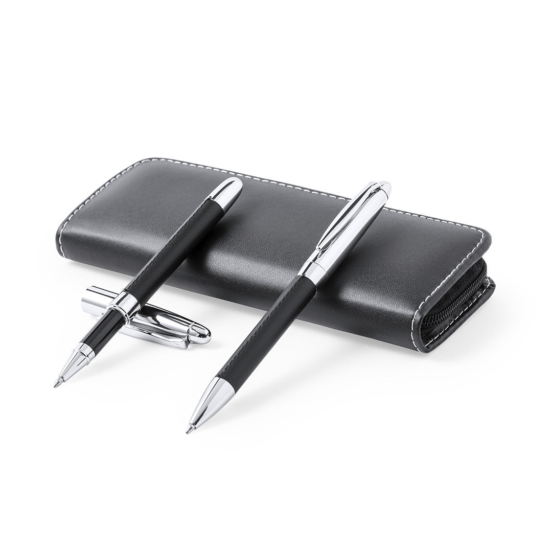 Set premium de bolígrafo y roller. Fabricado en elegante combinación de polipiel en tonos negros y metal cromado. Bolígrafo de mecanismo giratorio en tinta azul y con cartucho jumbo. Roller con capucha y tinta gel en azul, carga jumbo. Presentado en estuche individual de polipiel con cierre de cremallera e interior a juego con compartimentos individuales.