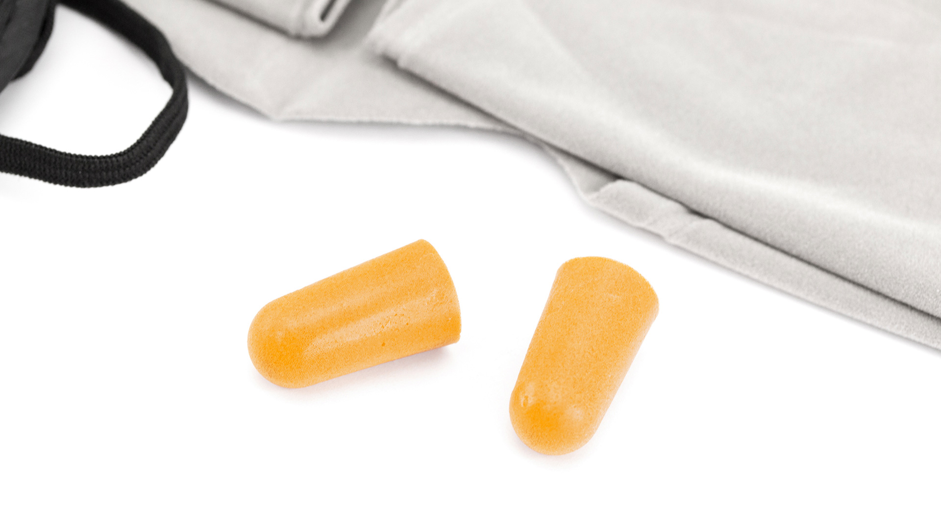 Set de viaje de 3 accesorios presentado en funda suave antelina en vivos colores. Incluye mascarilla en suave y confortable microfibra de acabado en color negro con doble elástico de ajuste a juego, almohadilla inflable para cuello en antelina y tapones en confortable material EVA de color naranja.