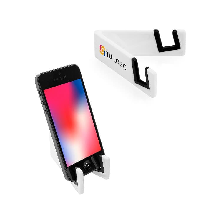 Soporte para dispositivo móvil de patas plegables y topes anideslizantes en PVC. En atrevidos colores y especialmente diseñado para marcaje en tampografía.