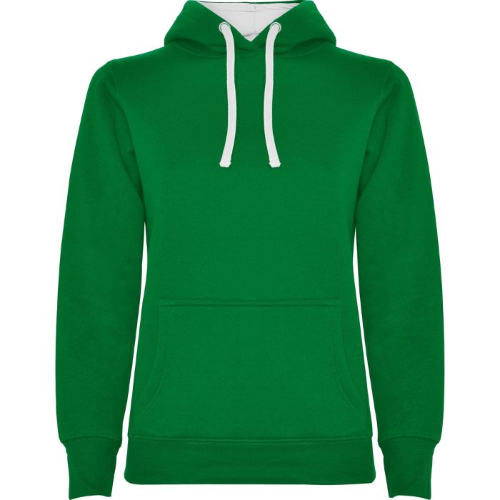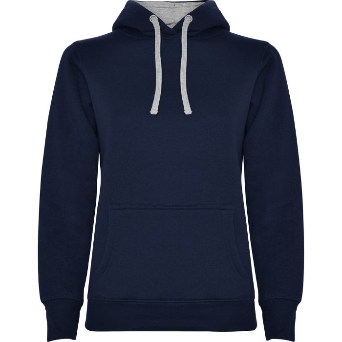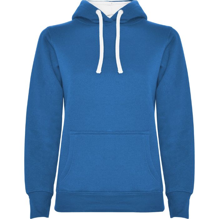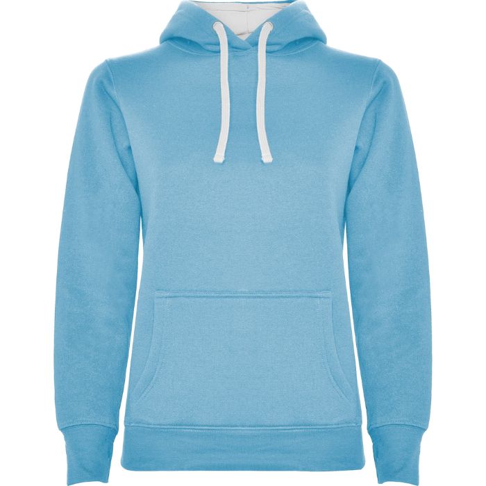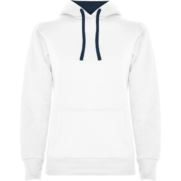 Sudadera entallada de corte femenino con capucha bicolor de doble tejido, con cordón contrastado ajustable, cubrecosturas en el cuello y bolsillo canguro. Punto canalé con elastano 1×1 en puños y cintura. Detalle thumb slit – puños con apertura para el pulgar.