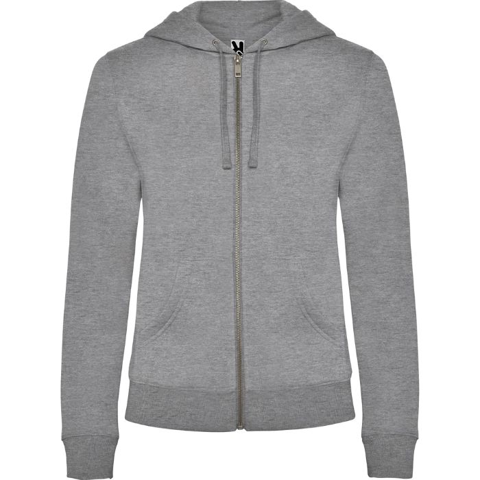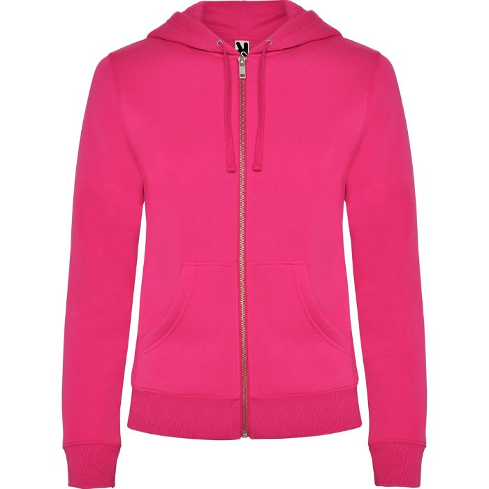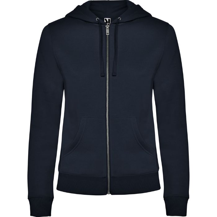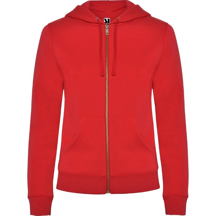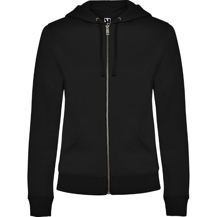 Sudadera de mujer con capucha forrada a tono. Cremallera metálica frontal y bolsillo estilo canguro. Cubrecosturas reforzado en el cuello interior, corte entallado, y punto canalé 2×2 en puños y cintura.