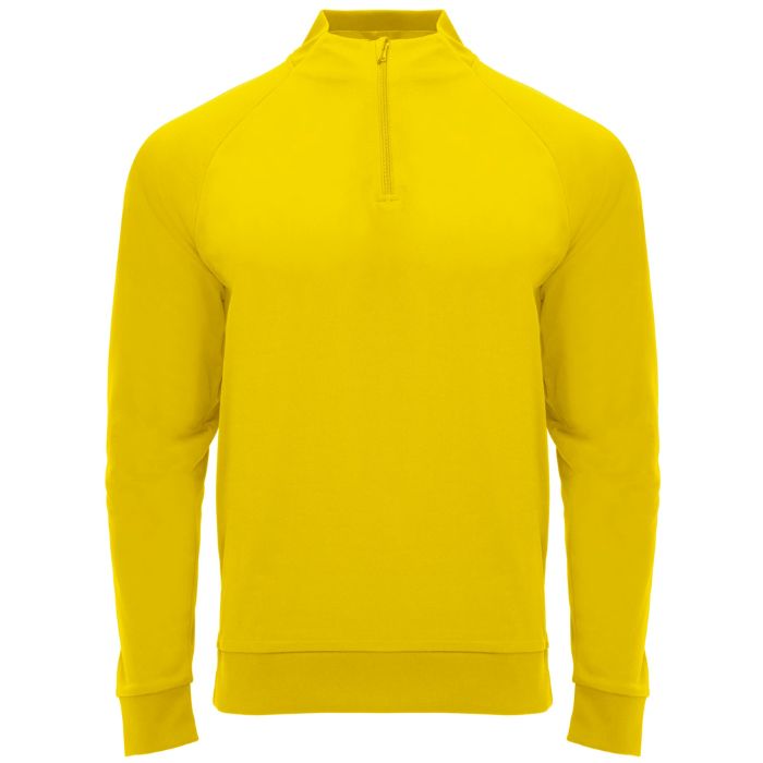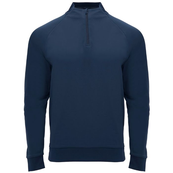 Sudadera de manga ranglán, con Interior perchado, cuello con media cremallera y cubrecosturas de refuerzo en su interior a tono. Parte posterior del cuello, puños y bajo en canalé 1×1.