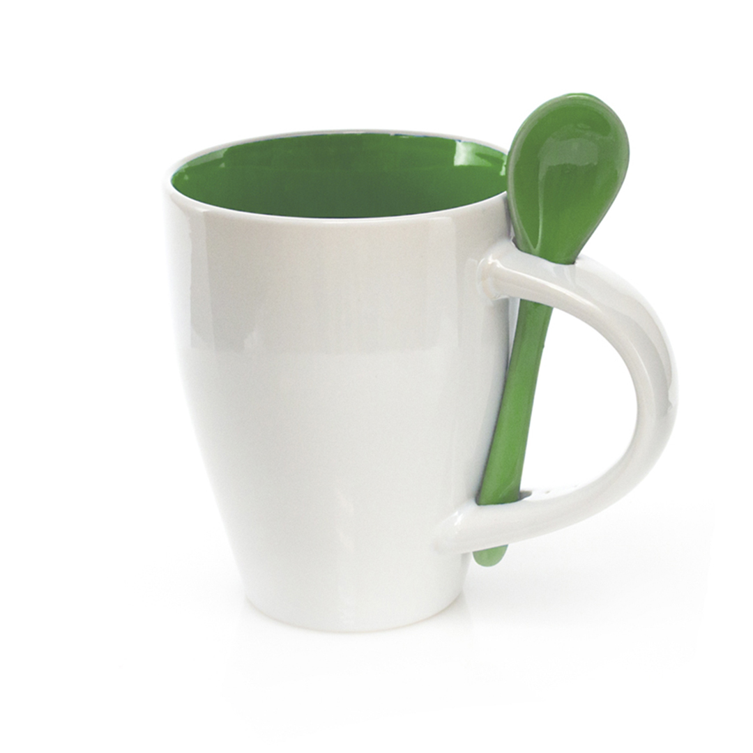 Taza de cerámica de 350ml de capacidad en divertida combinación de exterior en color blanco e interior en gama de vivos colores. Con cuchara de cerámica a juego integrada en asa y presentada en caja individual.