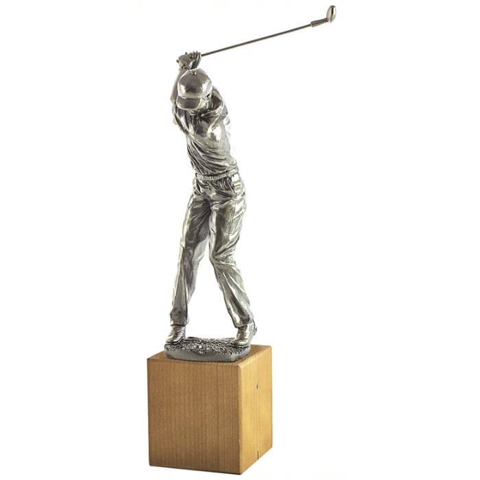Este impresionante trofeo, con una detallada figura de un golfista en plena acción sobre una sólida base de madera, es el reconocimiento perfecto para los amantes del golf. Ideal para premiar torneos y logros individuales.