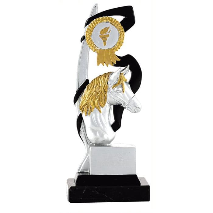 Captura la majestuosidad y elegancia de la equitación. El trofeo deportivo hípica tiene un diseño detallado que destaca un caballo en pleno trote, adornado con toques dorados y una base robusta, es el reconocimiento perfecto para cualquier competición ecuestre.