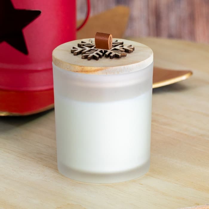 Vela con diseño navideño con aroma vainilla. Fabricada en cristal, con tapa de madera pulida y relieve diseñado en forma de copo de nieve. Presentada en caja individual kraft.